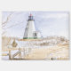 Disfrute de una mañana pálida de invierno en la costa de Massachusetts en esta relajante pintura acuarela de Plymouth Light en invierno. Esta pintura acuarela, que utiliza grises sutiles, amarillos claros y azules fríos, recrea una vista frigiosa de la icónica torre de Gurnet Light desde mediados de invierno. Construido originalmente en 1768, Plymouth Light era uno de los dos faros de Gurnet Point. La torre de la pirámide octogonal pintada fue construida en 1842 después de que las torres anteriores colapsaran. Para capturar este hito histórico en el sol invernal, el artista utiliza sutiles sombras en gris y azul, resaltando artísticamente la arquitectura única de la estructura. Los rojos, azules y verdes brillantes contrastan brillantemente con el paisaje invernal empobrecido por el sol, mientras que las ramas esqueléticas y los postes de vallas sombreadas en primer plano ofrecen una vista única de la bahía de Plymouth.