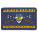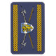 Se cruzan poleejes medievales tardíos detrás de un escudo en forma de calentador que lleva un león heráldico en este diseño original de Richard H. Fay.