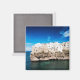 Imán fotográfico de recuerdo con casas construidas sobre un acantilado en el mar Mediterráneo en el pueblo de playa Polignano a Mare en la costa este de Puglia en el sur de Italia en un hermoso día de verano.