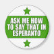 Muestra tu fluidez en el idioma internacional con este ingenioso diseño. El verdaj steloj añade un toque agradable. Pregúntame cómo decir eso en esperanto.