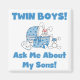 A la orgullosa nueva madre y padre de los bebés mellizos les encantará este lindo diseño que incluye dos conejitos de niños y texto azul que dice "¡Niños gemelos! ¡Pregúntame Por Mis Hijos!" Camisetas gemelas, tarjetas, botones, imanes, bolsas, ratones y otros!