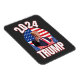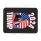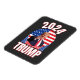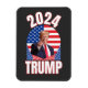 El presidente Trump Magnet. El presidente Trump está parado frente a la bandera estadounidense. Letras y números están delineados en rojo.