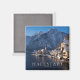 Imán fotográfico cuadrado con la ciudad de Hallstatt cubierta de nieve en la orilla del lago de Hallstätter Ver lago con montañas de los Alpes en el fondo a la primera luz del amanecer en un paisaje invernal en Austria con el texto 'Hallstatt, Austria'.