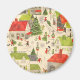 Diseño retro con rojo y verde limón. Aldea de navidades con árboles navideños decorados, casas decoradas, gente caminando por ahí y autos en los caminos. Cuto