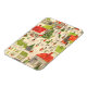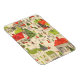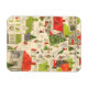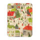 Diseño retro con rojo y verde limón. Aldea de navidades con árboles navideños decorados, casas decoradas, gente caminando por ahí y autos en los caminos. Cuto