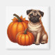 Imán Pug Adorable sentado al lado de calabazas y hojas