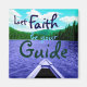Este imán muestra una fotografía de una canoa en un lago en Montana con las palabras "¡Que la fe sea tu guía!"