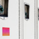 Abstract design with cracks and scratches. Colors gradually blend into the next color with a rainbow gradient effect. Colors include red pink orange and yellow.