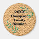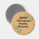 Cree un mantenimiento económico para su próxima reunión familiar con estos imanes únicos. El año y el nombre de su familia aparecen en el centro de este imán de refrigerador redondo. El texto está rodeado de ramas de árboles con hojas verdes brillantes. El fondo marrón se asemeja a un tejido de canasta o a un patrón de tierra rota. Todo el texto puede ser fácilmente personalizado para su gran reunión familiar.