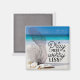 Un imán de citas inspiradoras muestra una fotografía natural de un cielo azul sobre el océano y una playa de arena con conchas marinas y corales. Incluye una cita motivadora, "Recen menos preocupación"._