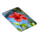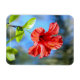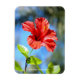Inhibisco rojo sobre el fondo azul del cielo y las palmeras, efecto de pintura