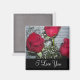 A delicate setting of red roses with baby's breath and a romantic page of sheet music behind them. The message can be changed if so desired.