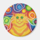 ¡Bebé! Un gato amarillo y naranja a rayas con bigotes giratorios y un fondo sicodélico con motivos de arco iris. Nevera imán con un diseño de personalizable amarillo, naranja, rojo, azul, verde, rosa, morado y blanco para que usted pueda personalizar con su propio texto, imágenes e ideas. Dibujo original de lápiz de colores realzados digitalmente por Jess Perry.