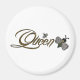 Refrigerador de Reina Bee Magnet- Un imán de texto de oro decorativo con una palabra cursiva: Reina. Dos pequeñas abejas creadas con purpurina de plata y oro embellecen el texto. El fondo es blanco sólido.