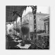 Imagen en blanco y negro del balcón del Royal Cafe, en el barrio francés de Nueva Orlean. La gente se amontona bajo los escaparates para salir de la lluvia torrencial.