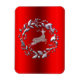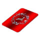 Un elegante imán de Navidades con un reno plateado saltando, dentro de una corona de Navidades metálicos plateados, sobre un fondo festivo metálico rojo.