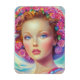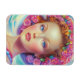 Impresionante retrato de fantasía de una mujer adornada con una corona de flores vívida y tonos pastel brillantes. Sus luminosos ojos azules y su suave expresión se complementan con una delicada mariposa y un florido aura de arcoiris. Este ilustracion de ensueño combina belleza, naturaleza y elegancia surrealista.
