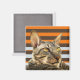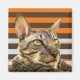 Magnet con Tabby puntiagudo gato de Cornualles llamado Benson. El fondo tiene rayas horizontales en marrón, naranja y gris. Para ver este diseño otros productos visite nuestra tienda Rex Cats.