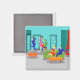 Este Retro Classic Television Magnet te lleva a un momento más simple. El estilo de los años 60, el dibujo minimalista y personalizado te hará buscar los créditos de apertura. El diseño muestra una sala de estar moderna y soleada de mediados de siglo, con paredes verde azuladas y turquesas y una chimenea roja en forma de cono, con una gran chimenea. Todos los ojos están puestos en el lanky, el hombre de la casa mientras hace su gran entrada. El apuesto señor lleva puesto un traje azul y corbata naranja. Su adorable señora y su enérgico y joven hijo se apresuran a saludarlo. La señora de la casa está usando un vestido rosado caliente, de vaina, que rellena en todos los lugares correctos. La vuelta en su pelo oscuro es pura perfección. Junior lleva puesta una camisa roja y jeans azules para ver si su padre le ha traído algo. ¡Guau! ¡No toques la planta maceta, Junior! En la planta baja se encuentra un sofá verde y una mesa baja naranja. ¡Espera! ¡Parece que tenemos invitados! En el sofá hay un hombre de pelo oscuro con traje azul y corbata roja, junto a una mujer rubia con un vestido rojo y un arco rojo en el pelo. ¡Hey! Son los compañeros de trabajo de papá. ¿Cómo llegaron primero? Es uno de los eternos misterios de la televisión. Parece que estamos listos para una gran noche en sitcom suburbia. Pero, primero, tenemos que ver si papá va a tropezar con el naranja otomano o lo va a esquivar con un poco de extravagante calzado. ¡Oh, la locura! Lo único que falta en esta escena es la canción. Y, si escuchas atentamente, probablemente puedas escucharlo en tu mente.