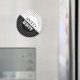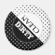 El imán del lavavajillas presenta un diseño sencillo en blanco y negro con puntos de polka.