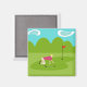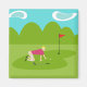 Este Retro Golfer Magnet es más divertido que un día en los verdes. El estilo de los años 60, el diseño minimalista no es nada del otro mundo. Cuenta con un solitario golfista en un frondoso y verde callejón. El golfista moderno de mediados de siglo está haciendo una verdadera declaración de moda en sus elegantes, elegantes pantalones de golf y camiseta de fucsia. El guerrero rubio, en forma, del fin de semana está de manos y de rodillas intentando alinear un tiro. O tal vez está intentando darle a la pelota un empujón en la dirección del agujero. ¿Realmente importa? A su lado, vemos un solo club de golf. Enfrente de él está el hueco esquivo, con una bandera roja, que le está burlando. El fondo está formado por una línea verde de árboles personalizados, un cielo acuático y dos nubes blancas con forma de riñón. Este diseño es seguro que será un agujero en uno con tu profesional de golf favorito.