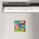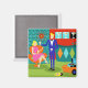 Este Retro Martini Couple Magnet parece una escena de una comedia romántica. El estilo de esta casa o apartamento de estilo minimalista de los años 60 presenta una decoración elegante y moderna de mediados de siglo. El elenco es una pareja atractiva que disfruta de una velada llena de conversación brillante, buena música y bebidas sin fondo. La habitación cuenta con un suelo verde y una pared de agua y ladrillo verde azulado. Descansar cómodamente en una silla de naranja mod es una mujer hermosa. Su vestido rosa brillante es lo suficientemente corto como para lucir sus gafas. Con la ola de una mano, esta belleza rubia tiene la atención inmediata de su admirador masculino. Su compañera de cabello limpio lleva traje azul, camisa blanca y corbata de arco negro. En sus manos, sostiene dos vasos de martini de cristal con aceitunas flotantes. No te preocupes. Él le está ofreciendo uno a su amiga. La pareja está teniendo un momento tan encantador que ninguno de los dos está notando la hora que aparece en el reloj kitsch, rojo, estridente en la pared de ladrillos detrás de ellos. En una pared roja y de fierro, hay tres pinturas clásicas de tela estiradas de Martini, también disponibles en la tienda Zazzle de StrangeLittle Onion (¡insinuación!). Dos de las impresiones tienen fondo turquesa y una está sobre un fondo negro dramático. Debajo de las impresiones hay un elegante bar húmedo. La parte delantera del bar verde azulado está compuesta por tres diamantes de arlequín, en tonos naranja, turquesa y verde. Podemos ver las siluetas de gafas de martini descansando en la parte superior del mostrador. Al otro lado de la sala, un naranja otomano sostiene un reproductor de discos portátil azul y negro. En el suelo, vemos los discos de vinilo y una portada de un álbum amarillo brillante. Este bonito dúo está teniendo un momento tan agradable que ninguno de los dos se está dando cuenta de la hora que aparece en el reloj kitsch, rojo, estelar sobre la pared de ladrillos que hay detrás de ellos.