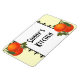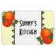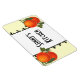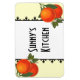 Un frigorífico imán de cocina con letras de deco y obras de arte de naranjas y flores naranjas en un fondo cremoso.