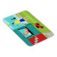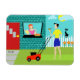 ¡Bienvenidos a Suburbia! El Flexi Magnet, de estilo retro, cuenta con una atractiva pareja de personalizados minimalistas en su pequeño rincón del paraíso. Desde la ventana de una casa de ladrillo turquesa y verde azulado, podemos ver a la señora Homemaker. La hermosa pelirroja lleva puesta una rana rosada caliente. Ella está sosteniendo en una mano una jarra de limonada recién exprimida. En el umbral de la ventana, delante de ella, hay una tubería caliente, casera, retretada, pastel de fruta en un plato de pastel verde. En el camino, frente a la puerta roja de la casa, el periódico enrollado del sábado por la mañana está esperando ser leído. El señor hombre de la casa está parado en el exuberante césped verde. Lleva pantalones cortos azules y una camisa amarilla que coincide con la disposición soleada de su esposa. Está parado detrás de una cortadora de césped roja. Podemos ver que ya ha cortado una franja de pasto, pero, en este momento, es difícil saber si está trabajando duro o apenas trabajando. La siembra parece estar paralizada mientras disfruta de un vaso de limonada. ¡Ah, refrescante! Al lado de la casa, el felino familiar está encaramado en una valla blanca de piquete. Snowball, el gato negro con nombre irónico, está mirando hacia abajo a sus fieles súbditos y a las flores naranjas y amarillas que bordean la valla. El sol amarillo está asomando por detrás de nubes azules claras y onduladas. El cielo es la sombra del agua reservada para Hometown, EE.UU. en obras de arte kitschy, de mediados de siglo, modernas.