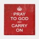 Es gracioso pero inteligente "rezar a Dios y continuar" mercadería por la persona cristiana o religiosa. Juegue con las palabras del vintage poster de propaganda de la Segunda Guerra Mundial "mantengan la calma y sigan adelante". Fondo rojo angustiado con corona blanca y letras.