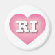 Este imán presenta un corazón rosado con un centro encalado que contiene las letras mayúsculas, en negrita y blancas, RI, la abreviatura oficial de Rhode Island, el estado del océano.