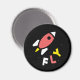 Retro, pop, colorida creación de un cohete, Redondo imán. Tema especial del coloreado rojo, amarillo y blanco, con un simple pero elegante icono de estilo artístico. Estilo pop retro, diseño único.