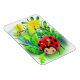 Imán rojo, lindo ladybug en un fondo de hierba y flojo