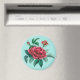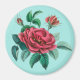 Dibujo de acuarela vintage de una rosa roja con hojas de esmeralda verde sobre un fondo turquesa claro. Se puede cambiar el color de fondo.