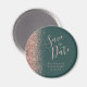 El borde izquierdo de este elegante imán Save the Date cuenta con un borde purpurina falso de oro rosa. El texto del personalizable combina el guión de escritura a mano rosa rosa con el tipo de letra serif en un fondo verde oscuro.