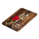 Fije el tono para su próxima granja rural o nupcias temáticas de rancho occidental con las encantadoras Rosas Rojas y Bodas de Campo de bit a caballo Ahorre el imán flexible de fecha. Este rústico matrimonio ecuestre personalizado de moda tiene como protagonista a un imán de dátiles con una pintoresca fotografía floral realzada digitalmente de flores de rosa rojas, collar de perlas, trozos de caballo y riendas de cuero con un fondo de granero marrón.