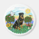 Sol feliz, pájaros felices y un feliz Rottweiler que se sienta en el exuberante césped en un hermoso día con brisas suaves soplando.
