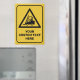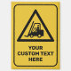 Signo de advertencia amarillo en forma de triángulo. Aviso: Camiones elevadores de horquilla y otros vehículos industriales. Color de fondo personalizado. Texto personalizado.