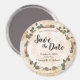 Rustic eucalyptus save the date magnet featuring a natural wood slice design with soft greenery accents. This round woodland wedding save the date magnet is perfect for rustic weddings, forest ceremonies, barn venues, and nature-inspired celebrations.