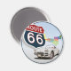 Ruta 66 con Corvette Chevrolet blanco de 1961, y línea con estados para mostrar dónde corre la carretera. Esta icónica carretera va de este a oeste desde Chicago, Illinois a Santa Mónica, California. Aunque la ruta 66 ya no existe técnicamente, ¡cerca del 85% de la misma todavía se puede manejar hasta el día de hoy!