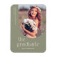 Este moderno imán de invitación de graduación cuenta con una tipografía elegante y un marco fotográfico de arco exterior al centro. La frase "El graduado" está escrita con una fuente simple y moderna debajo de la foto. El nombre del graduado se centra bajo la tipografía, mientras que la escuela y el año de graduación se escriben verticalmente a lo largo del lado izquierdo de la foto. La tipografía es de color crema clara con un fondo verde sabio.
