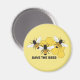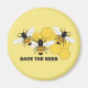 Un ilustracion gráfico de una abeja de miel y un panal de miel de la artista/diseñadora Charmaine Paulson en un imán de "Salven las abejas".
