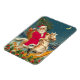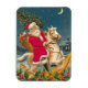 Vintage illustration of Santa Claus on a white wooden horse, carrying a Christmas tree with colorful baubles and a basket full of toys under a clear blue night sky with a bright shining moon and stars on a cold winters night.
