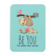 Un imán flexible con un dicho divertido: Sé tú, el mundo se adaptará. Diseñado con un ilustracion de un lindo lazo marrón colgando boca abajo. Este pequeño y gracioso se aferra a una rama que tiene un pequeño pájaro rosado a un lado de la rama y un ramo de rosas al estilo de doodle al otro lado. Debajo de ellos hay un arreglo de flores pintadas a mano de colores. Este adorable perezoso también tiene mejillas rosadas y 3 lindos corazoncitos en el trasero.