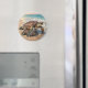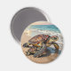 Coastal themed magnet with an illustration of a mama sea turtle and baby crawling into the blue ocean waves on a sandy beach.