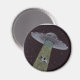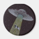¡Un dibujo a lápiz de color de una desafortunada vaca secuestrada por extraterrestres en un platillo volador adorna este divertido imán!