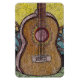 Una reproducción de una obra de arte surrealista y mixta adorna este imán único. El punto focal es una guitarra que se baña bajo el sol.