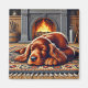 Un perrito irlandés Setter duerme tranquilamente sobre una alfombra estampada cerca de una gran chimenea, rodeado por un interior rústico y acogedor con un ambiente cálido y acogedor.