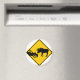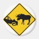 Señal internacional de carreteras y autopistas que aconseja que el alce gane cualquier confrontación con un auto. Se informó de Rótulos en el Parque Nacional Gros Morne, Terranova, Canadá.