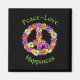 Este imán presenta un signo de paz floral en tonos rosa, amarillo, naranja, violeta, verde, blanco y negro rodeado de "Paz, Amor, Felicidad".