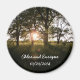 Un bonito diseño boda personalizado con árboles al atardecer, silueta con el sol brillando a lo largo de las ramas del árbol. La luz del sol está jugando sobre las flores silvestres bajo los árboles.
